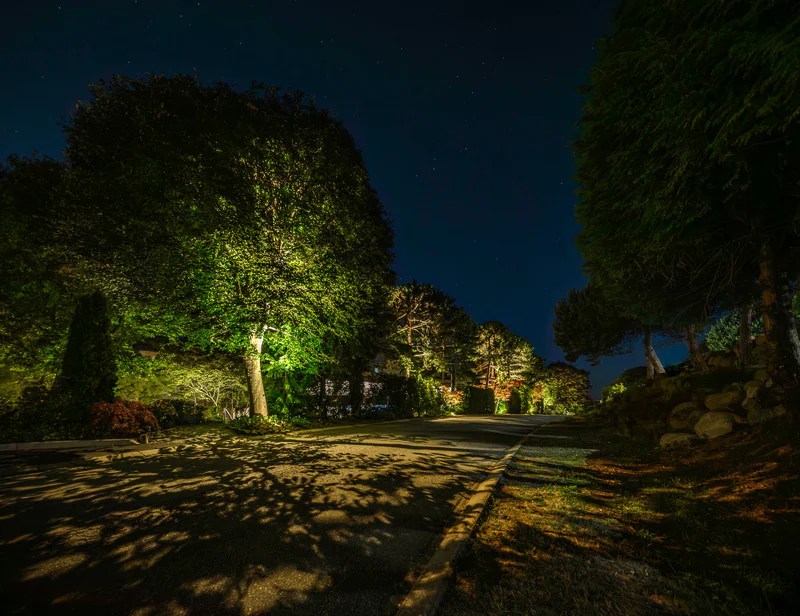 This property is a 7-acre strata complex where Borealis Landscape Lighting was brought in during the spring of 2025 to showcase design options for the larger community. Rather than illuminating the entire property immediately, the strata council elected to trial a smaller, feature-rich section: a landscaped island of trees, shrubs, and rockwork. This test site allowed residents to see Borealis' range of capabilities in a manageable and cost-effective way before committing to broader phases. Despite its scale, the section presented real challenges—particularly with overgrown shrubs that made cable and conduit runs complex. Borealis' commitment to thoughtful planning and execution ensured that even small details were handled with precision.7 acres